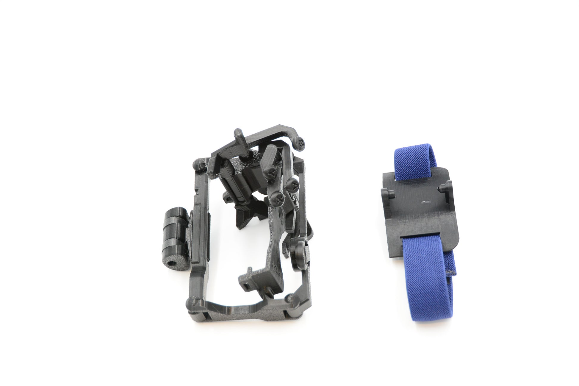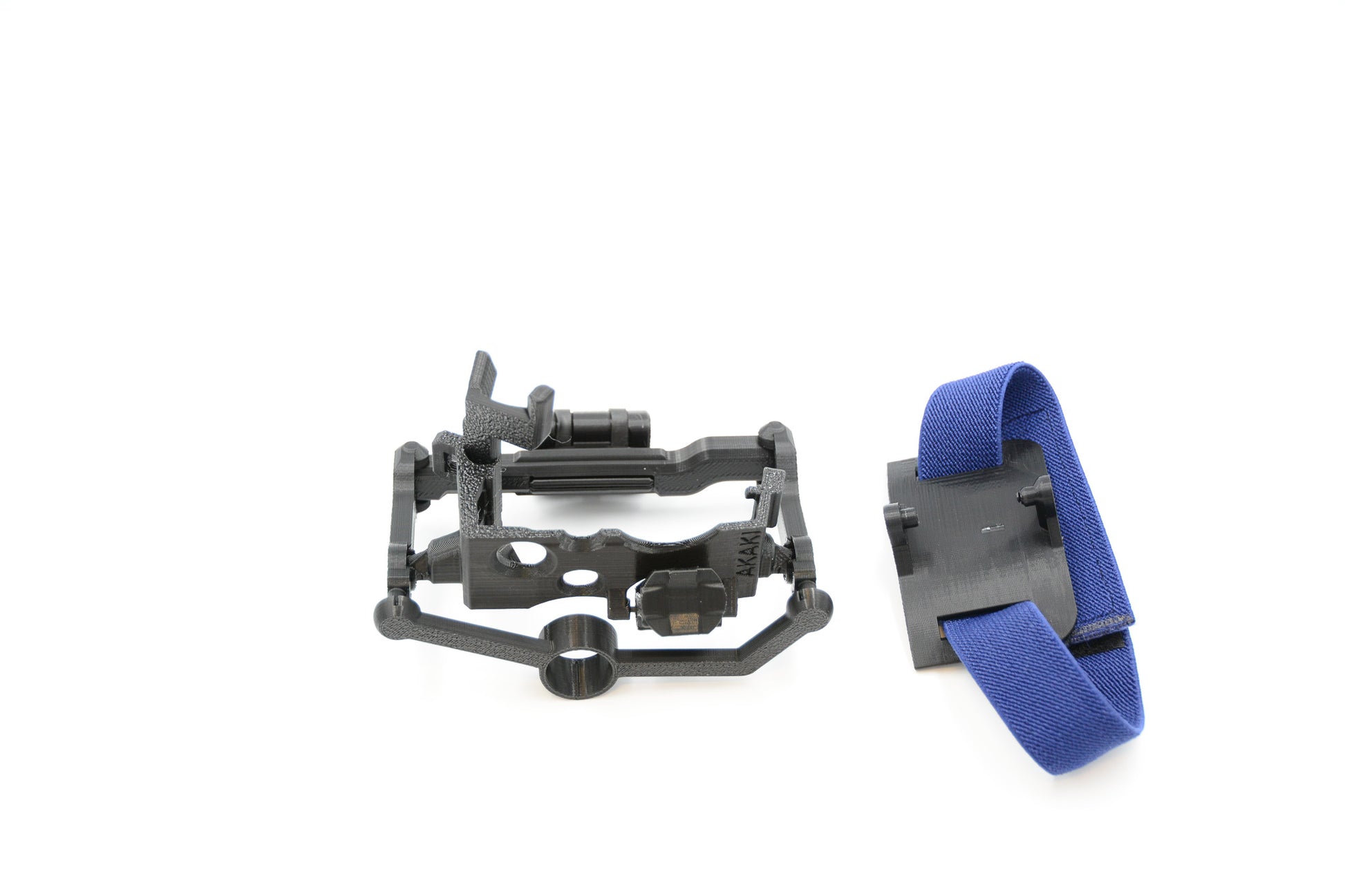 Left and right-handed version are different. Both sets included the attachment itself, a leg strap, and some rubber bands for stick tension (rubber bands not pictured).